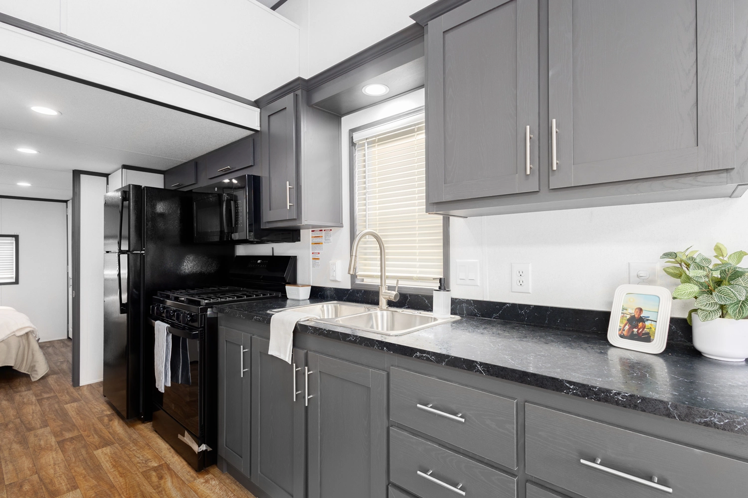 • Residential black kitchen appliances (17.5 cu ft. refrigerator, 30" gas range, microwave)