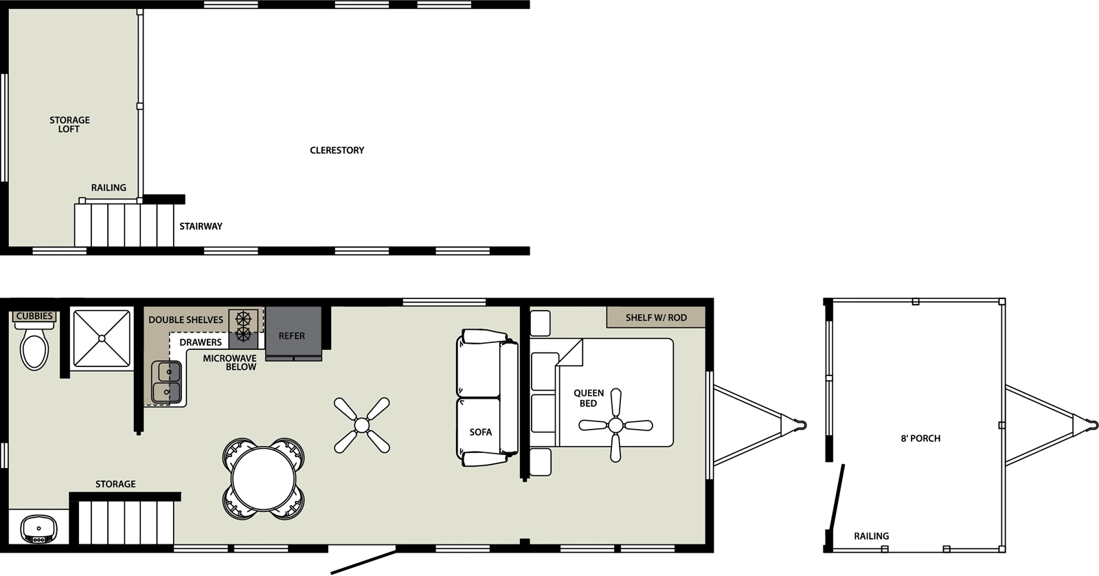 With 396 sq ft and a loft layout, this model maximizes space by lifting sleeping quarters above living areas. Its durable construction and efficient footprint makes it appealing for outdoor enthusiasts who need flexibility, function, and a strong connection to nature.