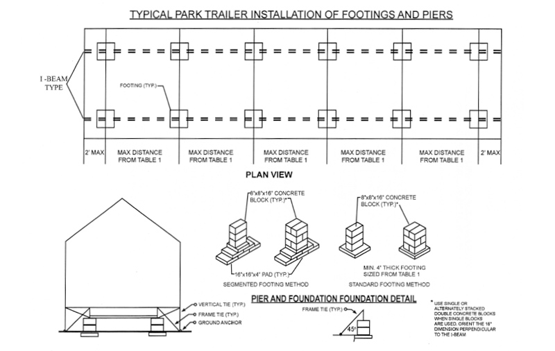 Park Trailers constructed by Forest River are designed to be supported by a "pier and beam" foundation. A park trailer constructed in this manner utilizes the steel undercarriage as an integral part of the foundation system. The weight of the Park Model is supported by the under carriage which is placed on a series of "columns" or "piers."