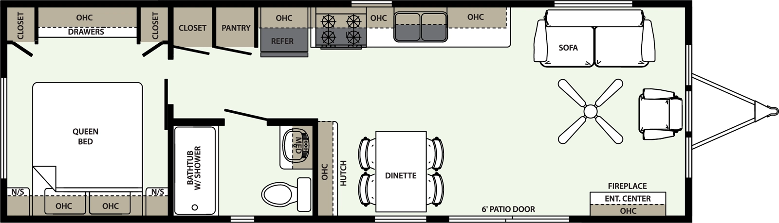 At 377 sq ft, the 355FL-C delivers an efficient one-bedroom, one-bath layout on a rugged I-beam chassis. R22 insulation and thermopane windows boost energy performance, making this park model perfect for seasonal visits or long campground stays.