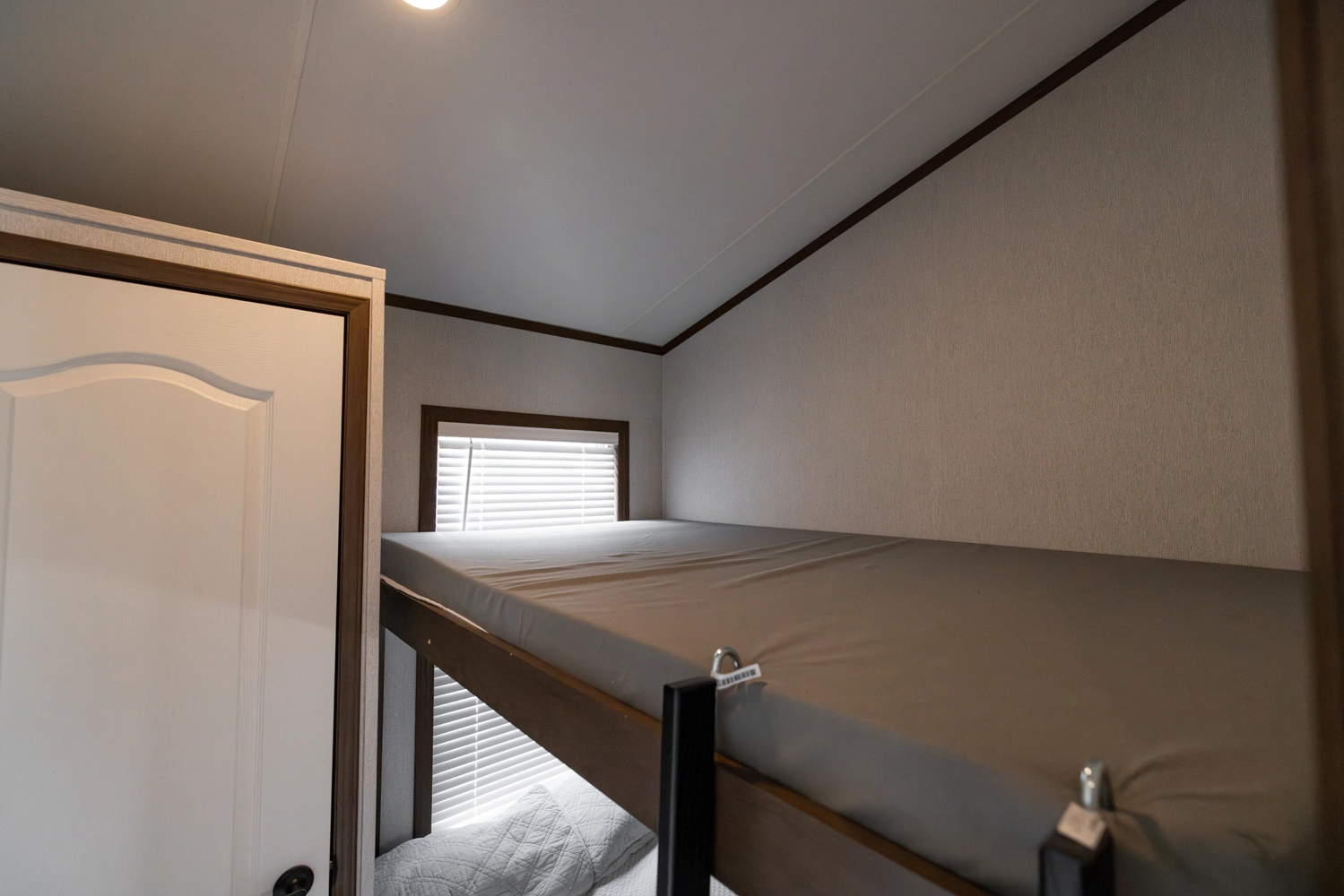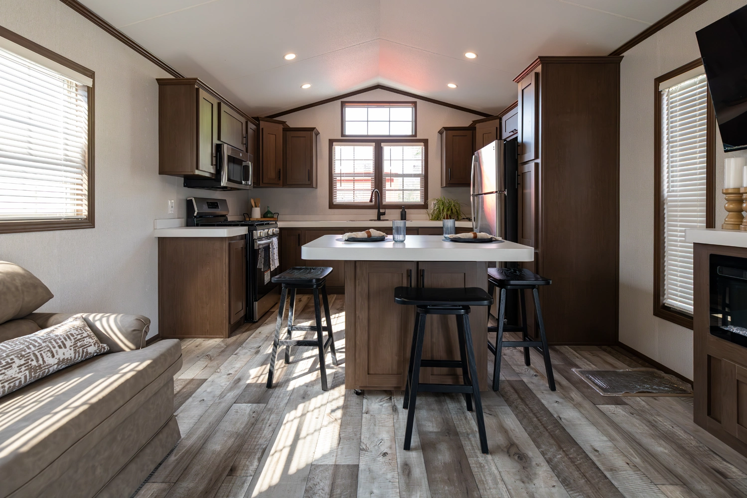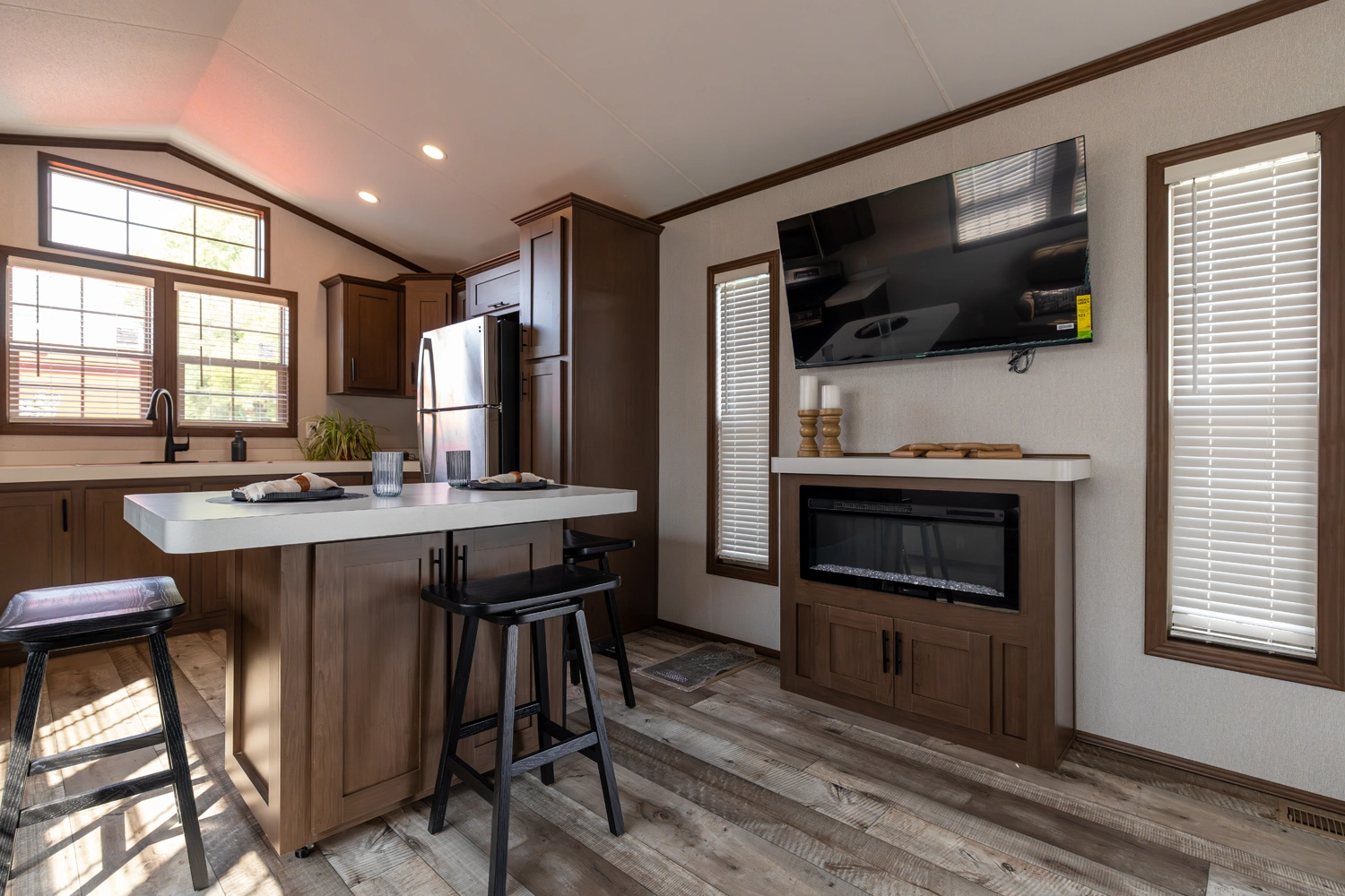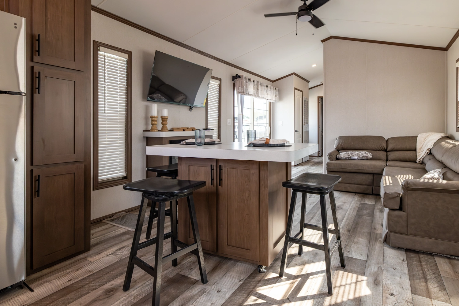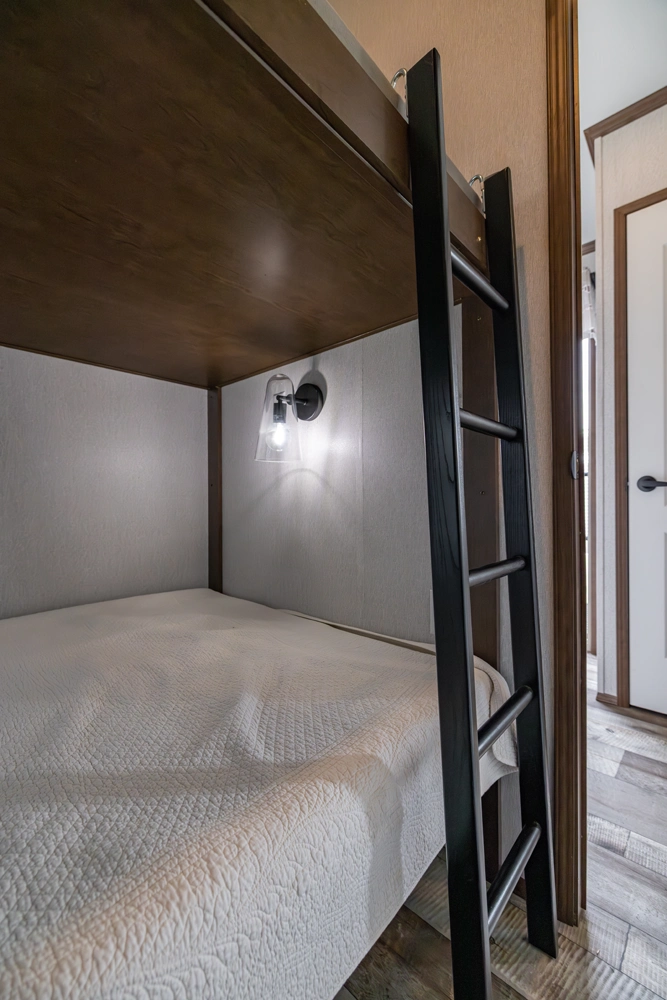 The 44FKBH-C spans 533 sq ft with a front kitchen, two bedrooms including bunks, and a dedicated living area. Its layout balances private and communal zones, while durable construction and solid insulation provide reliable comfort for seasonal stays at campgrounds.