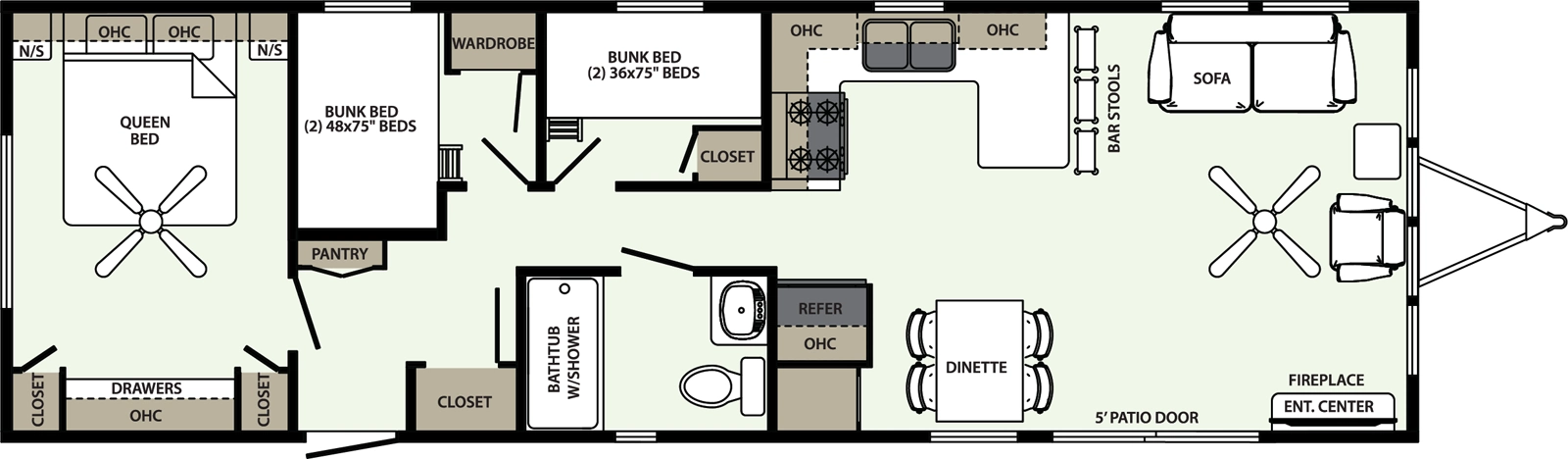 This 533 sq ft model has three bedrooms to accommodate larger groups or families. Its durable I-beam chassis and climate-conscious insulation make it a reliable and functional choice for seasonal or extended stays.