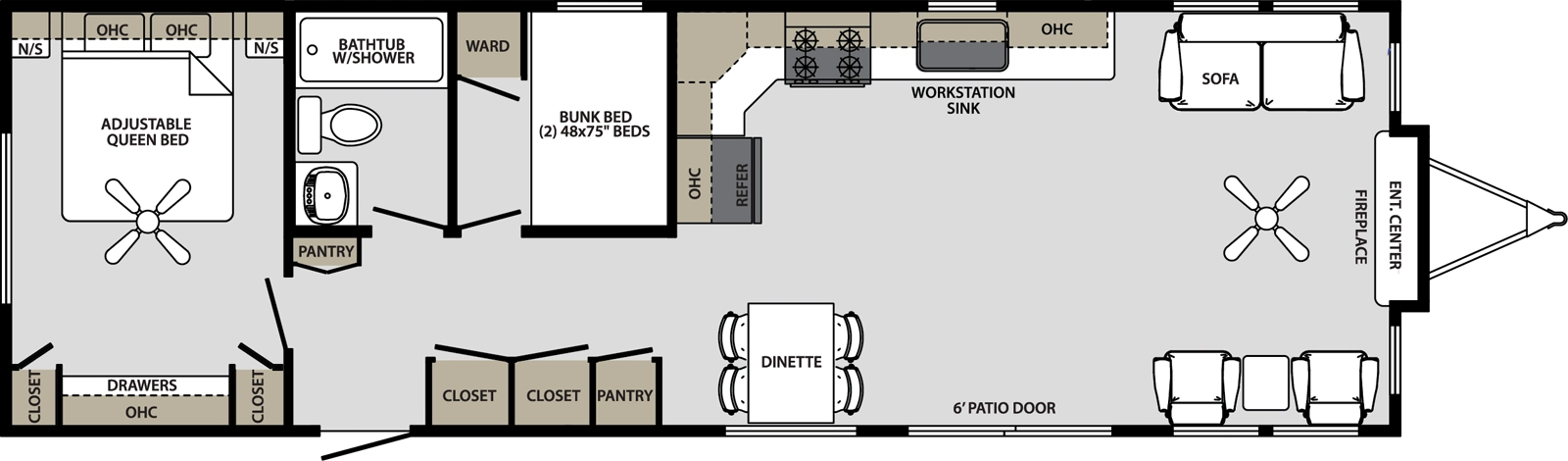 This 41' × 13' floor plan features two bedrooms, an open living area with front entertainment center, and a raised bar in the kitchen. Built for entertainment and comfort, it is your basecamp for epic nature weekends.