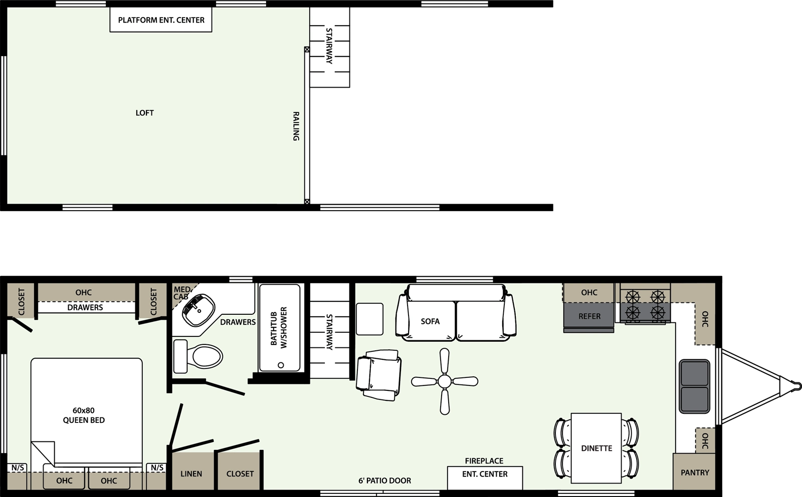 The 40 FKL delivers 396 sq ft with a front kitchen and a loft above that adds functional overhead space. Dormers enhance the loft with extra room and daylight, while the main floor stays open for cooking and gathering. Durable construction and a well-planned layout make this a great option for long seasonal stays