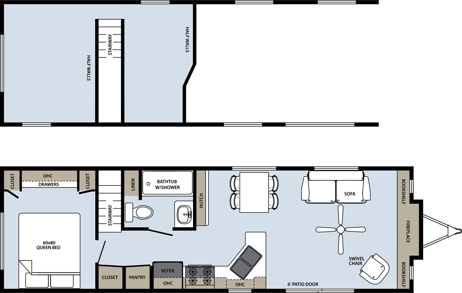 This 396 sq ft model features an open loft layout for flexible space. The loft adds extra room, while the main level stays open and efficient, maximizing usable areas for social or solo time. Strong construction and practical finishes make it a dependable choice for RVers who want quality and space.