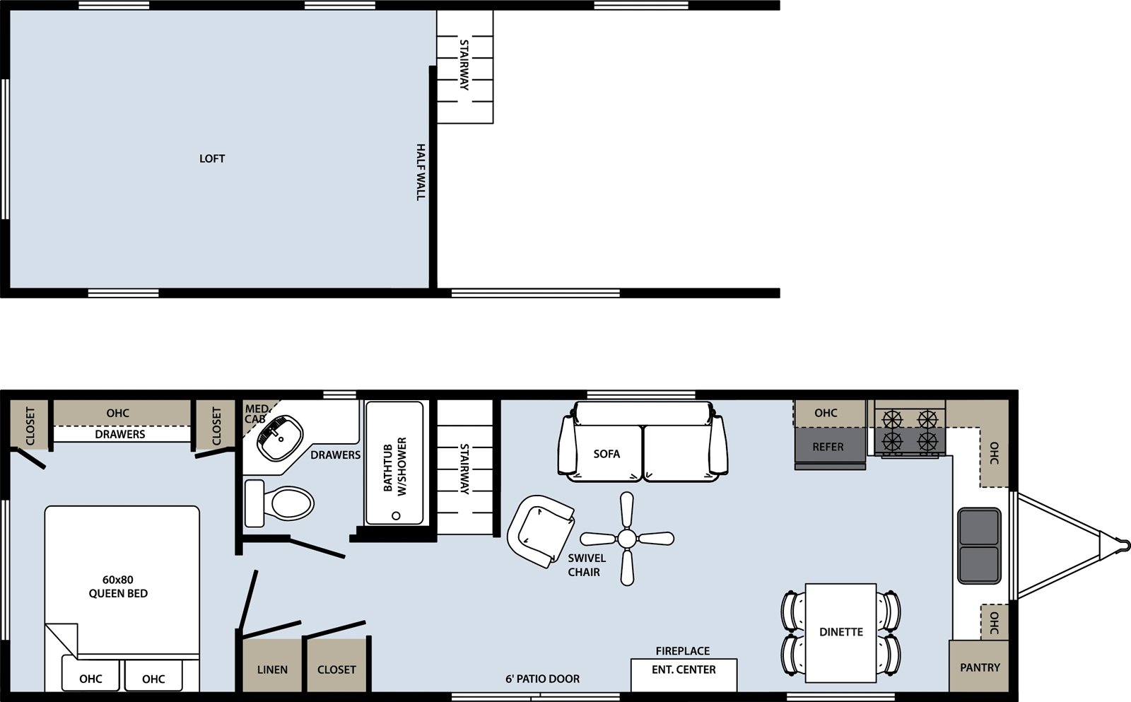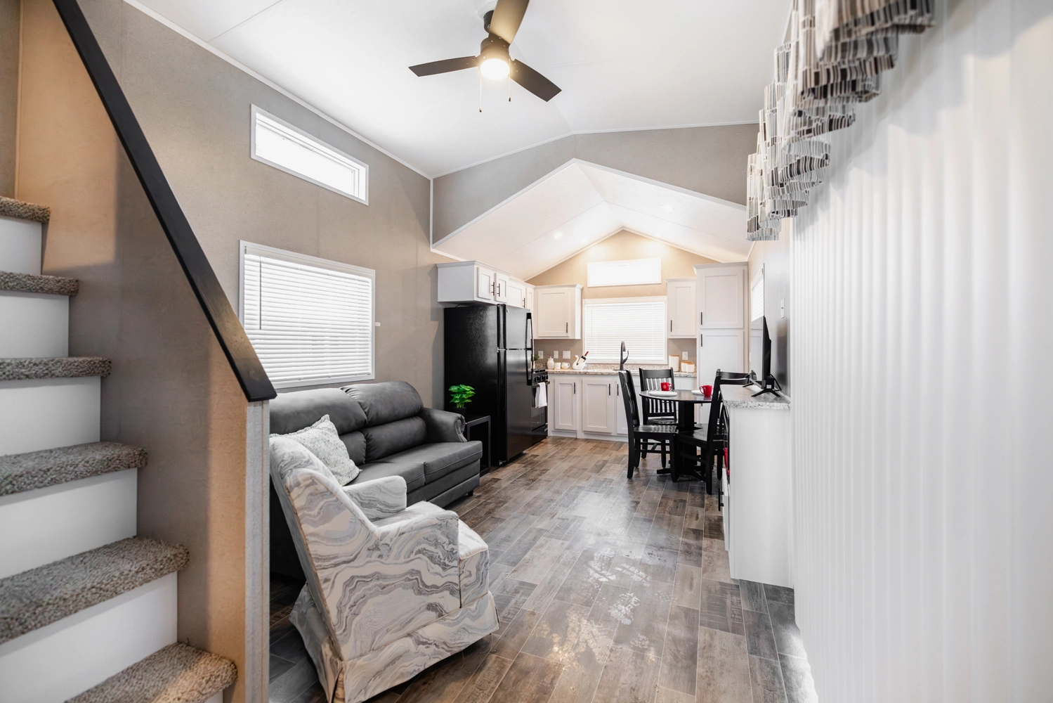 The Summit 40FKL-S offers 396 sq ft with a front kitchen layout below and a tall loft above. Dormers extend the loft for more headroom, and the main level remains open and practical for meal prep or relaxing. Designed with durable construction and energy-efficient features, it’s built for a lasting outdoor lifestyle.
