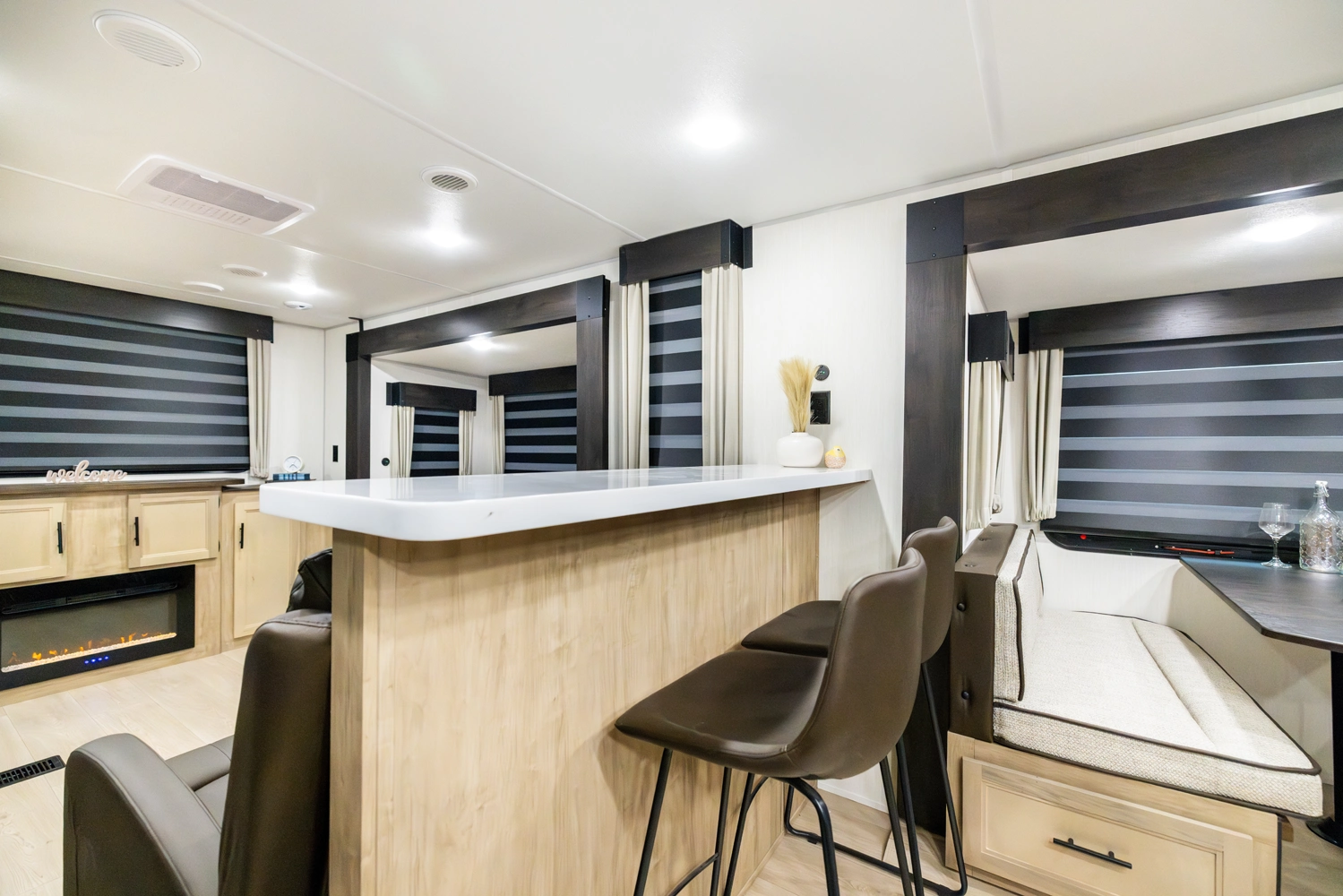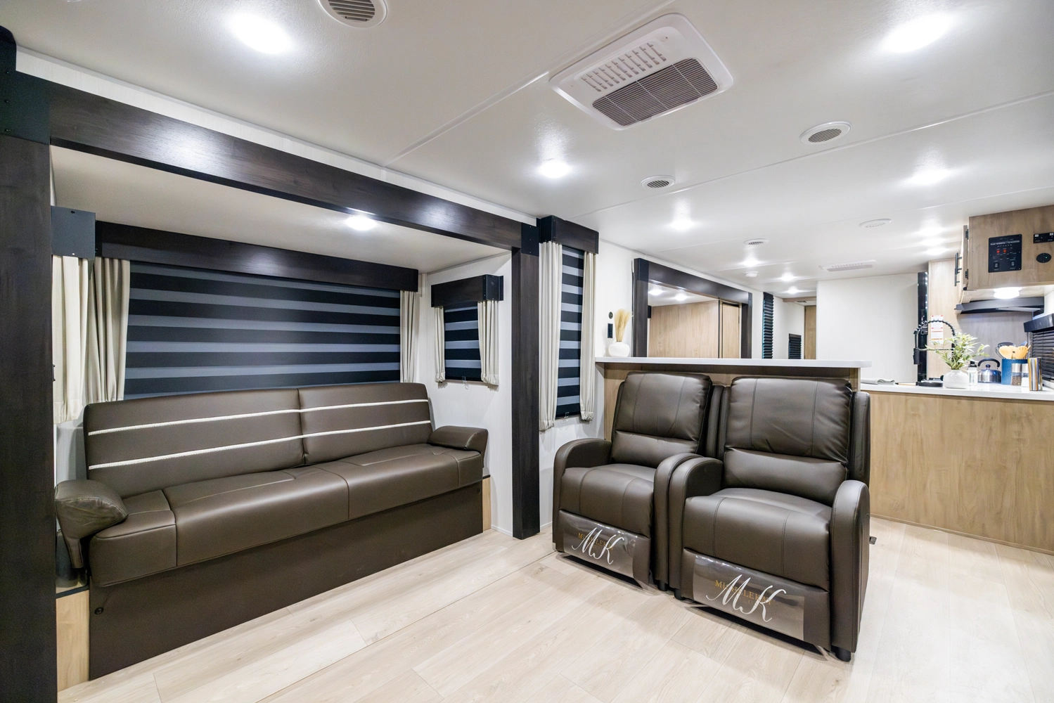 The triple slide is the perfect unit for affordable luxury and livability. The rear entertainment living room is surrounded by panoramic windows as well as two sofa slide and two recliners. The chef’s kitchen, kitchen bar with stools, and dinette slide with slide out drawers and full door pantry offer meet the needs of any chef. The private master suite completes the interior. Outside enjoy the Cherokee camp kitchen, outside entertainment speakers, and TV bracket under our power awning.