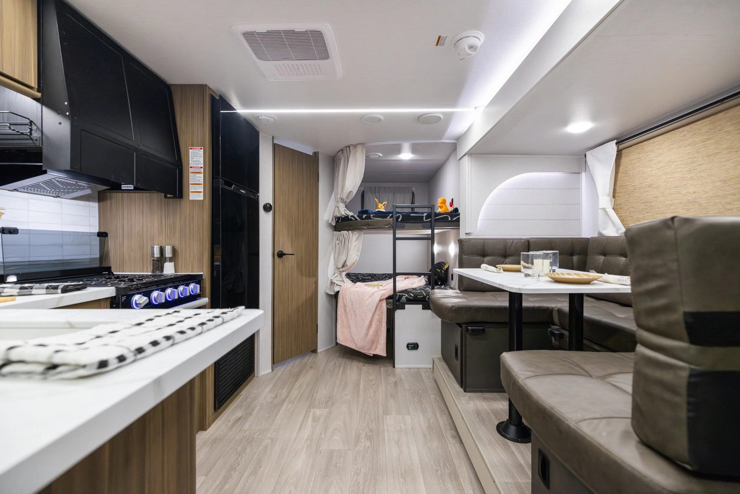 The 240BHXL weighs in at less than 6,000 lbs. for increased towability, without sacrificing any of the comfort! This double-over-double bunkhouse packs a lot of features into its 28'10” length, including a large comfy booth dinette with panoramic windows, walk-in pantry, modern kitchen with stove, cooktop, microwave, and an oversized refrigerator! The bathroom provides a walk-in shower with skylight and a convenient second door to the outside.