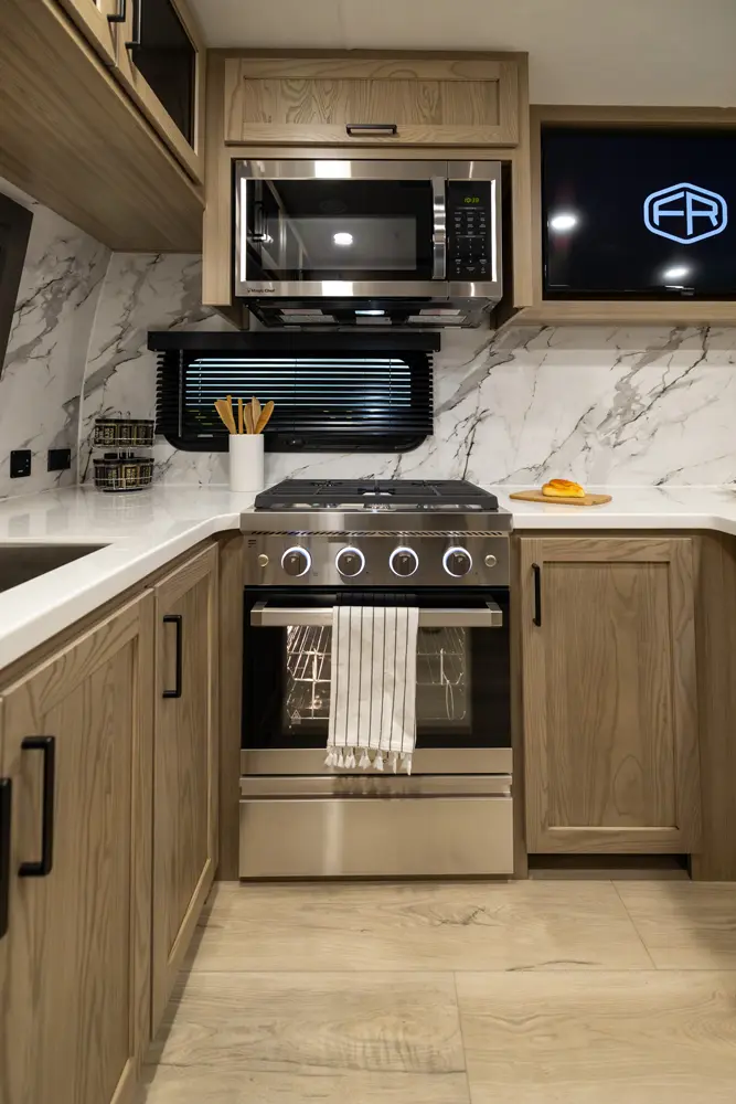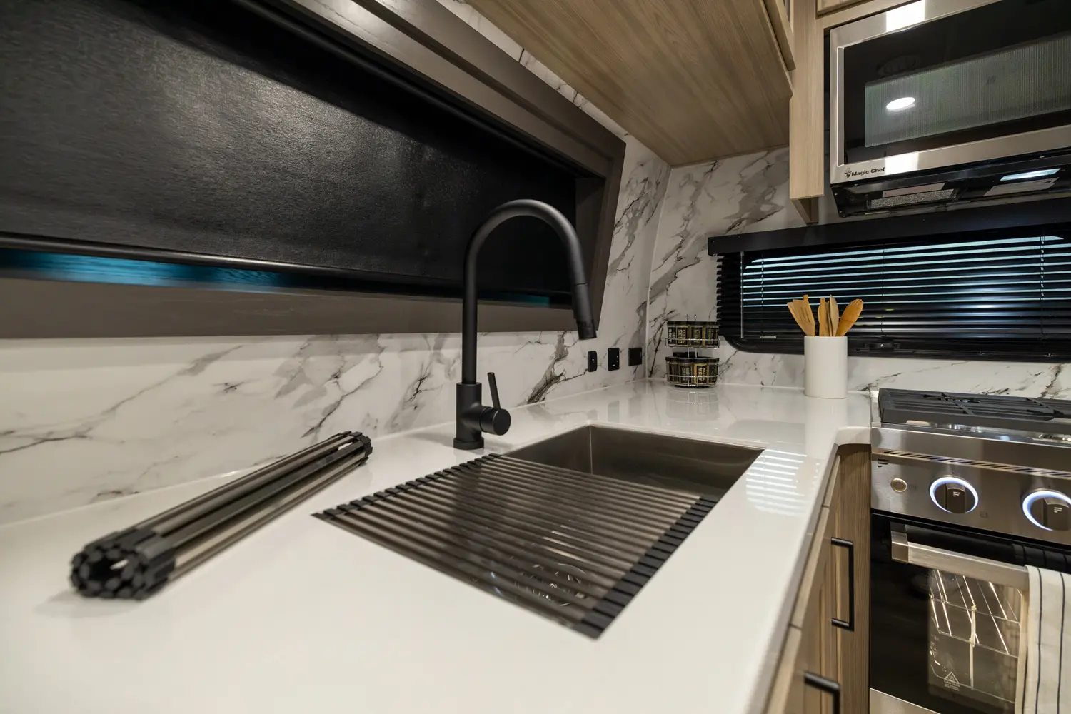 EXQUISITE, EXPANSIVE INTERIORS AS THE NORM. WELCOME TO THE CLASSIC SERIES, REDEFINING THE CAMPING EXPERIENCE THROUGH AN ARRAY OF REMARKABLE FEATURES. With its inviting open floorplans and ample storage capacity, there's room for those cherished guests or family you wish to bring along. As you nestle into the embrace of a plush king or queen sized bed, the restlessness of your adventures fade away. Through its efficient layout and panoramic windows, the classic travel trailers offer you an opportunity to luxuriate in your surroundings, all while enjoying the comfort of your serene interior.