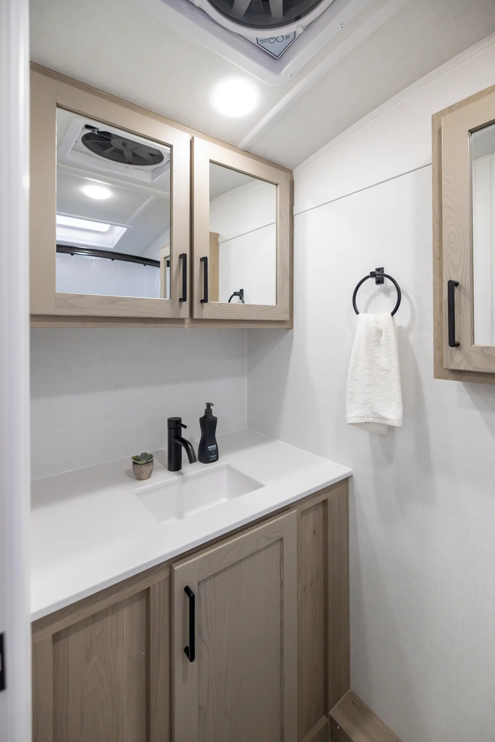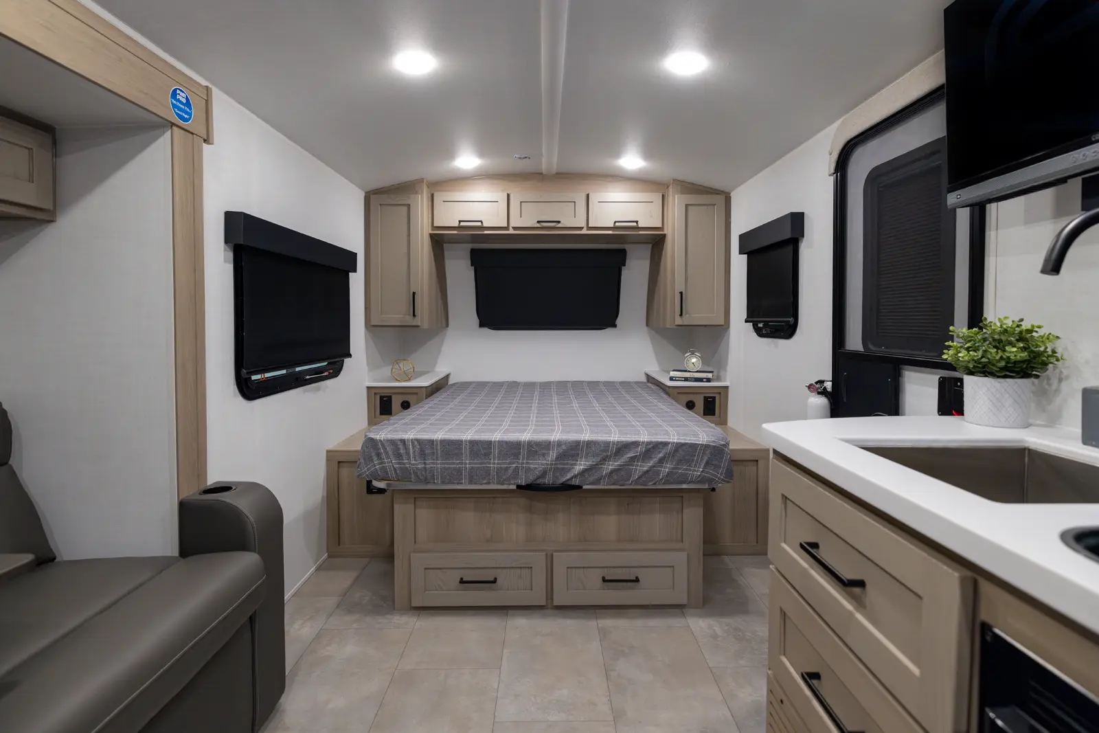 With this Flagstaff E-Pro E20FBS, the “we heard you” theme continues, this unit has a full walk around bed that the public is asking for. The large bathroom across the rear of the coach with an oversized shower makes using the facility roomy and comfortable. The 72” sofa is large and can rotate into a comfortable hide-a-bed. If you desire a stationary walk around bed in a single axle, this is the unit for you.