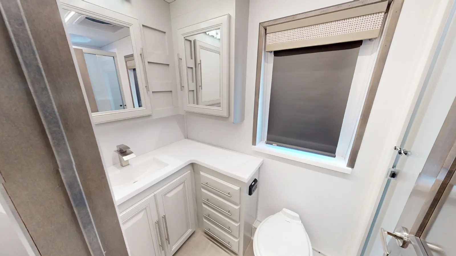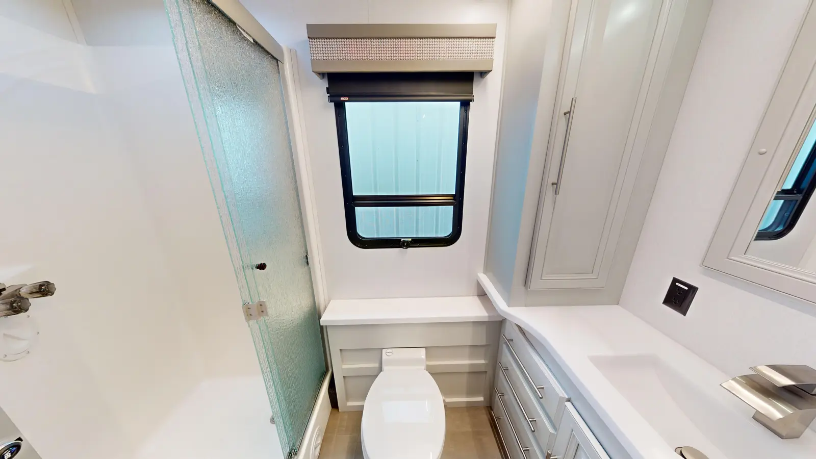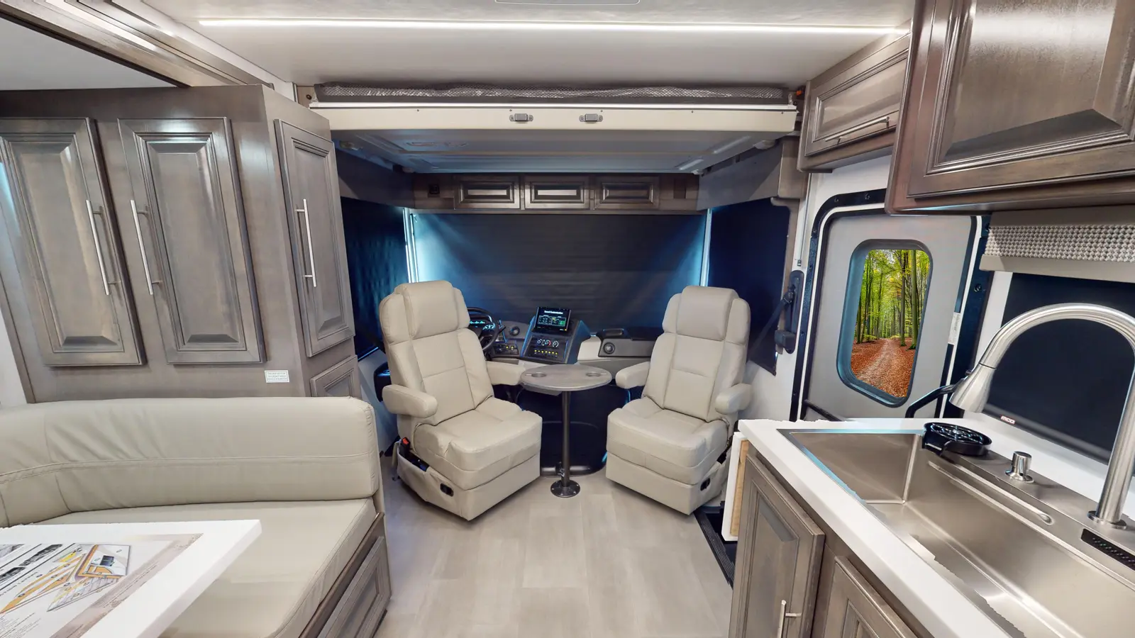 The Georgetown 36K7 by Forest River is designed for family comfort with two full baths and bunks. The kitchen features a farmhouse sink, 3-burner cooktop, microwave, and residential refrigerator. Enjoy entertainment in the theater seats across from a TV. The mid-ship full bath is across from the bunk beds. The bedroom offers a king bed and optional washer/dryer, plus a full master bath. The cab features swivel captain seats, a table, and a power overhead bunk.