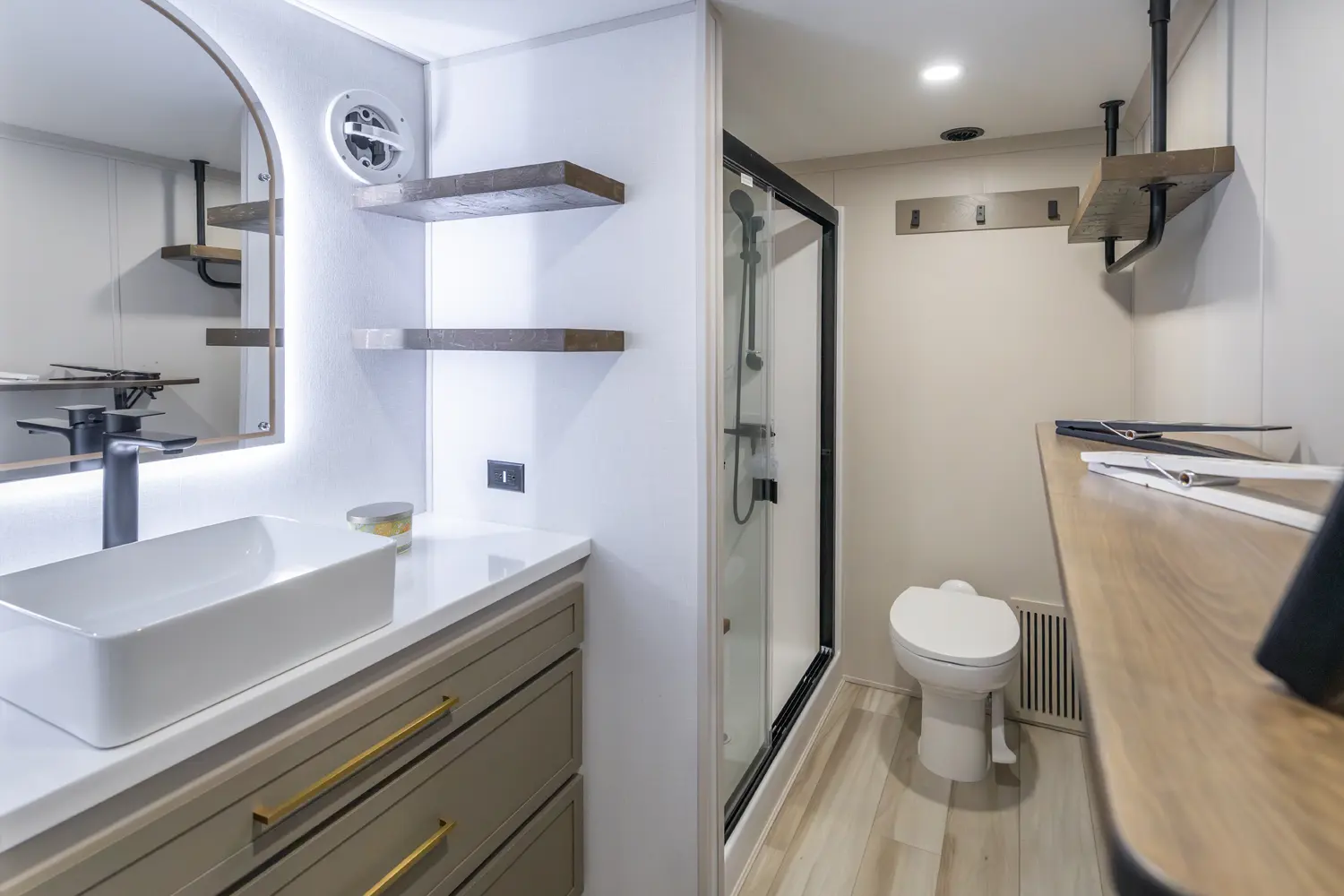 The ROOST43 provides a new segment to the RV market with a combination of a destination trailer in fifth wheel form. This creates the opportunity to move from locations easier than bumper pulling and provides the most square footage in this segment of RVs (530 Sq.Ft. compared to 399 Sq.Ft.). The ROOST43 is feature packed with residential style kitchen appliances, HUGE rear den, two lofts, bath and a half, laundry room, and an elegant interior design. The ROOST43 is will set a new era for RVing.