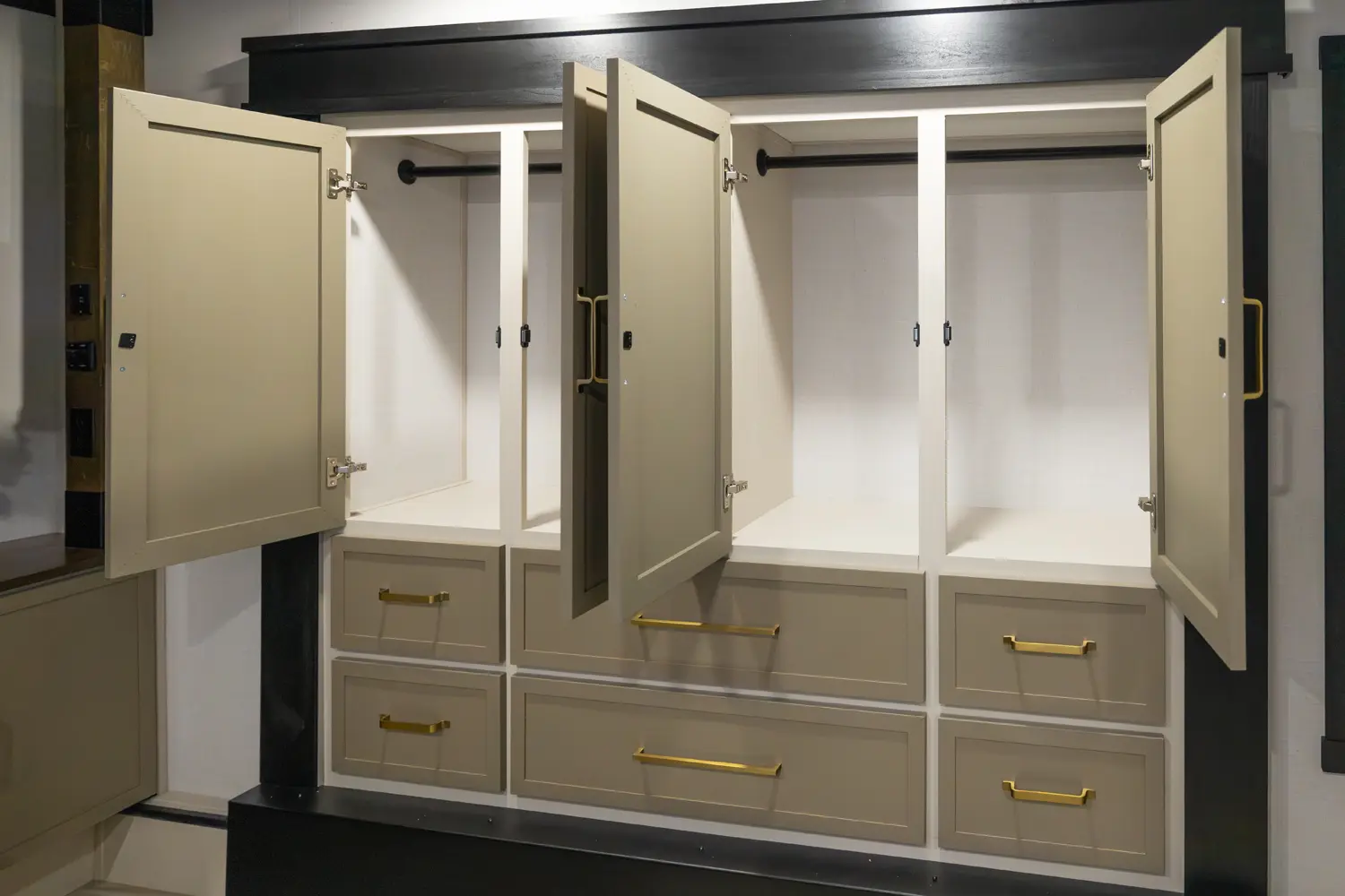 • Hardwood Temple Cherry Door and Drawer Fronts with Matte Gold Hardware