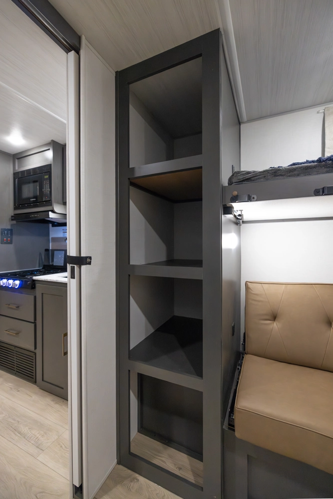 The 2026 Ibex New Trail Edition TRAIL31 offers a front queen bed, a central living area with dinette & sofa, and a private rear bunk room — perfect for kids or guests. It features a walk-through bathroom and a full kitchen with microwave/air-fryer and 10 cu ft fridge. Includes 50-amp service, washer/dryer prep, and a tankless water heater, designed with superior construction.
