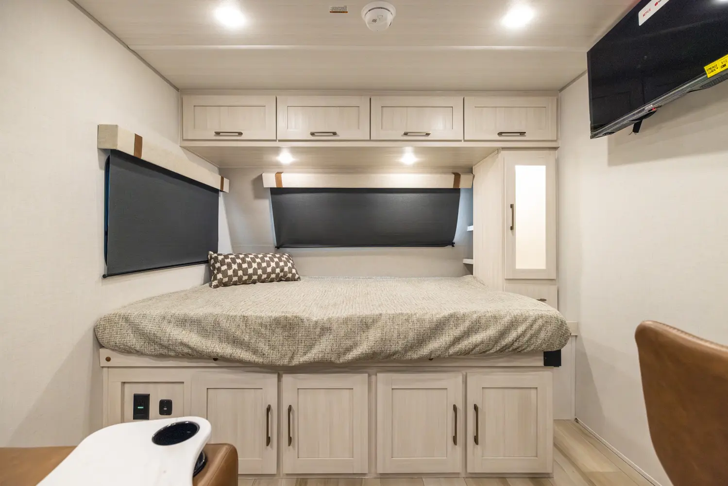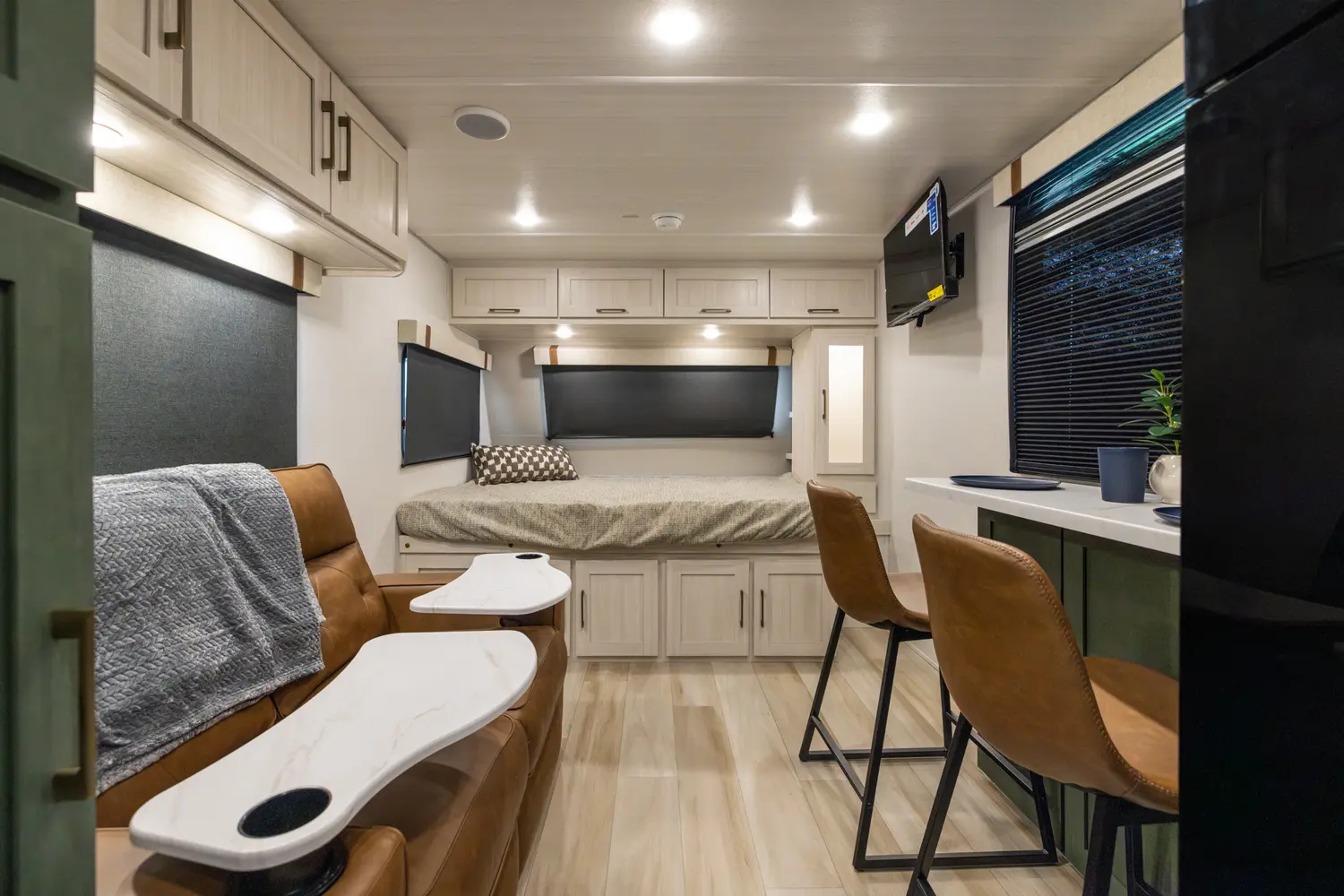 The NB18.2 is a compact, versatile travel trailer ideal for couples or small families. At just over 21 feet, it’s easy to tow and smartly designed for comfort and efficiency. The rear kitchen offers a roomy fridge and two-burner cooktop, while the bar-top counter with flip-up window creates a perfect indoor-outdoor dining space. Lightweight and adventure-ready, the NB18.2 blends comfort, function, and outdoor connection.