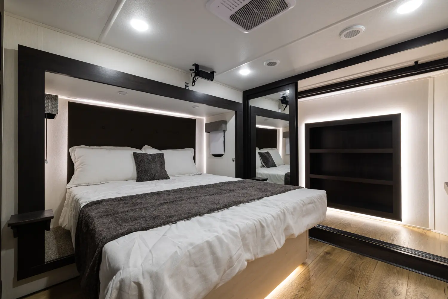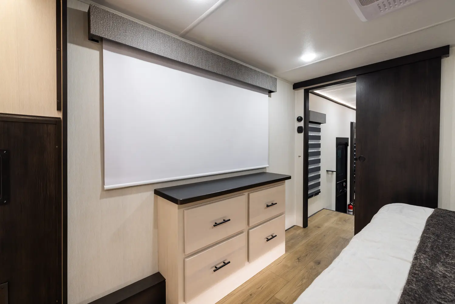 Discover the future of 5th wheel RV living with the Sabre Sundeck 33RLP by Forest River. This innovative RV features an industry-first retractable patio deck, extending your outdoor living space. Inside, you’ll find a L-shaped sectional, perfect for relaxation, and an impressive entertainment center complete with a fireplace. The fully equipped kitchen is a chef’s dream, boasting ample solid surface countertops, a residential-style oven, an air fryer microwave, and a 12-volt refrigerator.