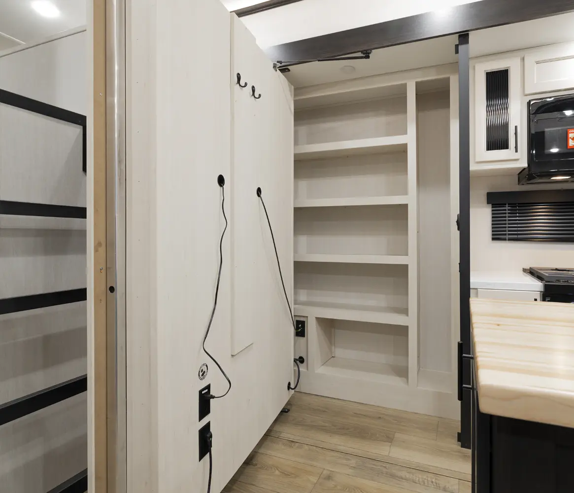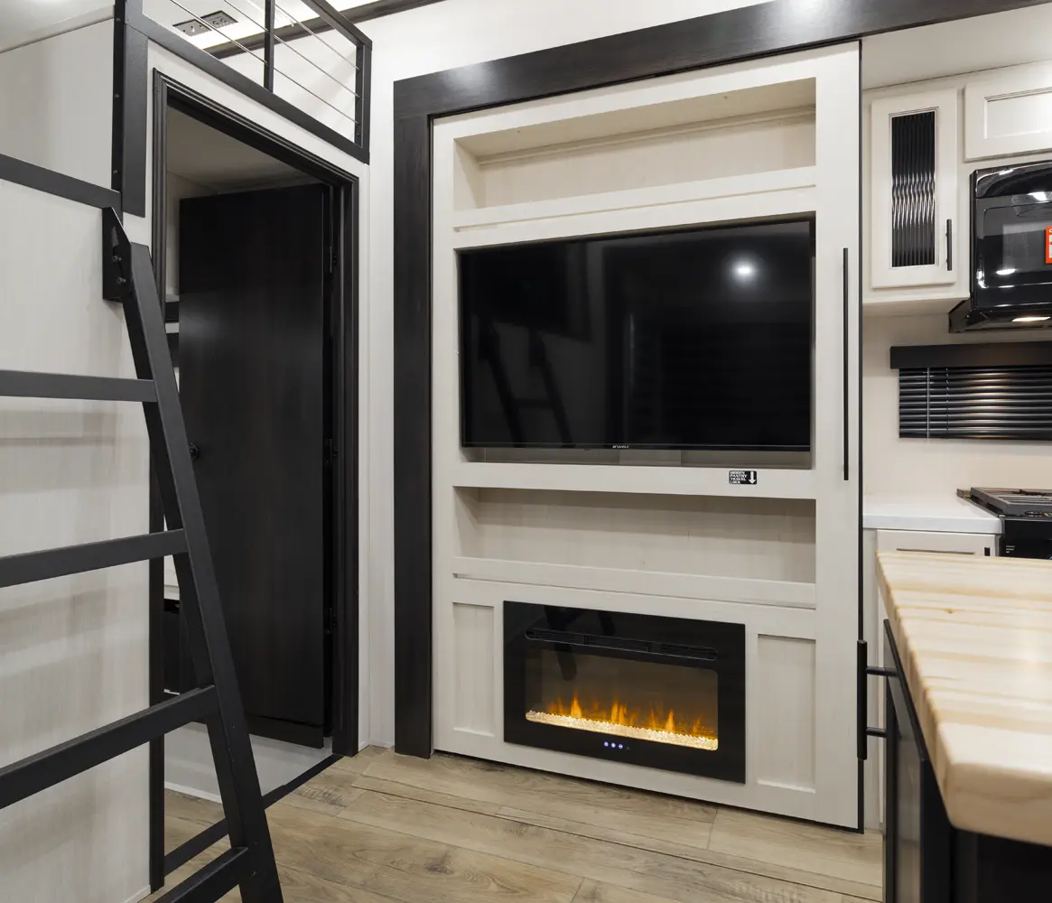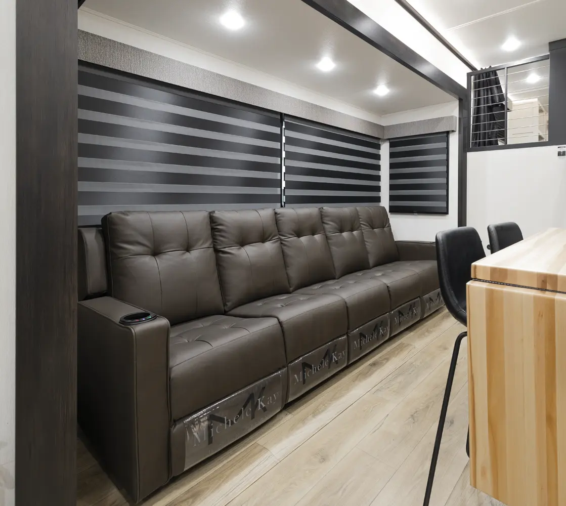 Experience the ultimate in 5th wheel RV living with the Sabre 36DBB by Forest River. This spacious two-bedroom layout offers a luxurious guest suite with a queen-size bed, ample wardrobe space, and a private bathroom with a shower. The innovative drop-frame chassis design creates a spacious loft, perfect for accommodating additional guests or extra storage. The island kitchen with its stylish butcher block wood finish and extendable seating completes the picture of comfort and style.