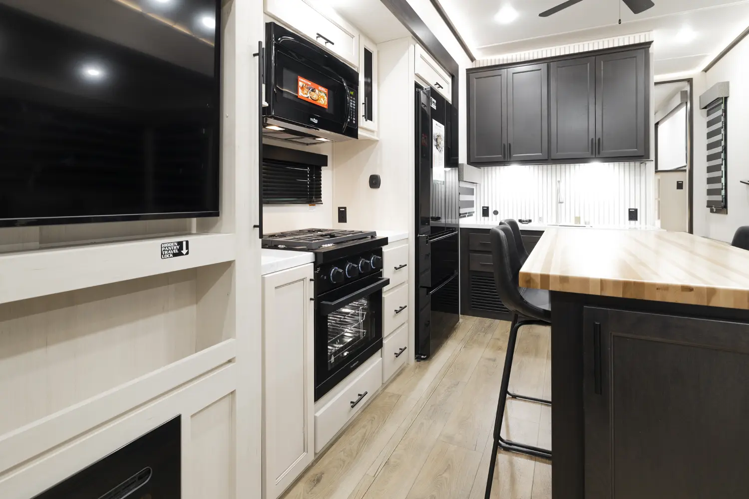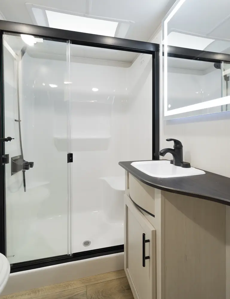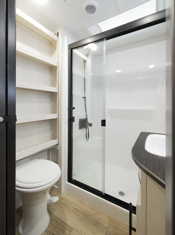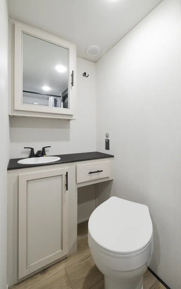 Experience the ultimate in 5th wheel RV living with the Sabre 36DBB by Forest River. This spacious two-bedroom layout offers a luxurious guest suite with a queen-size bed, ample wardrobe space, and a private bathroom with a shower. The innovative drop-frame chassis design creates a spacious loft, perfect for accommodating additional guests or extra storage. The island kitchen with its stylish butcher block wood finish and extendable seating completes the picture of comfort and style.