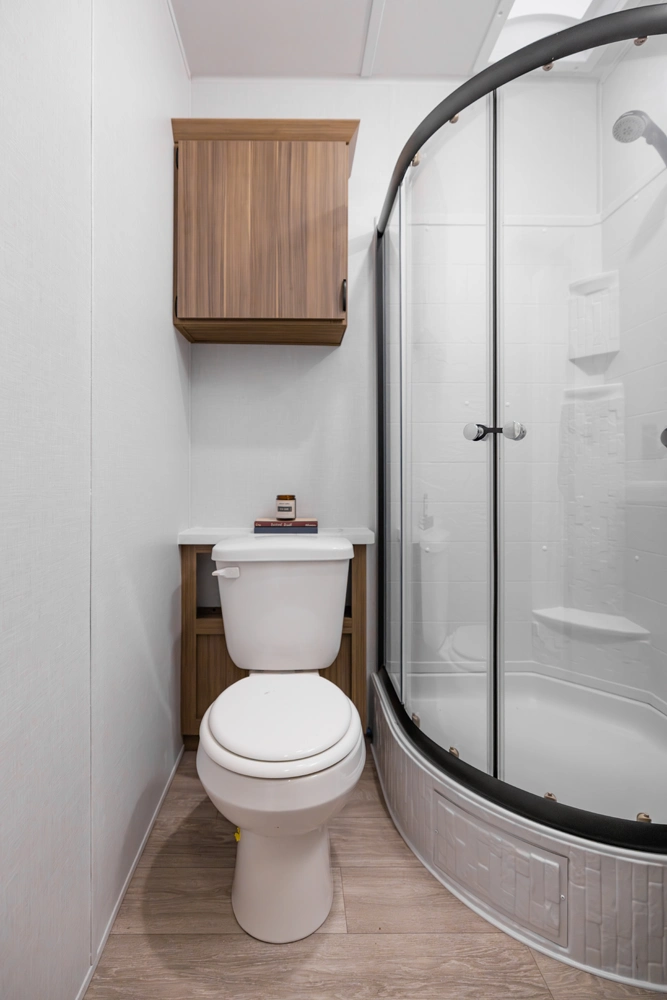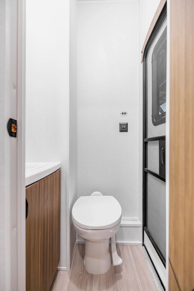 The 42QBQ is the ultimate bunkhouse, with four slides and an outdoor kitchen. The large front queen bedroom includes plenty of closet and cabinet space, while the adjacent bathroom gives you a walk-in radius shower. The living area features panoramic windows, fireplace (heater), and a tri-fold sofa. The bunk room provides 3 bunks plus the Versa-Queen giving the option of having another bunk, sofa, or queen bed. Do not forget the half bath with convenient door to the outside.