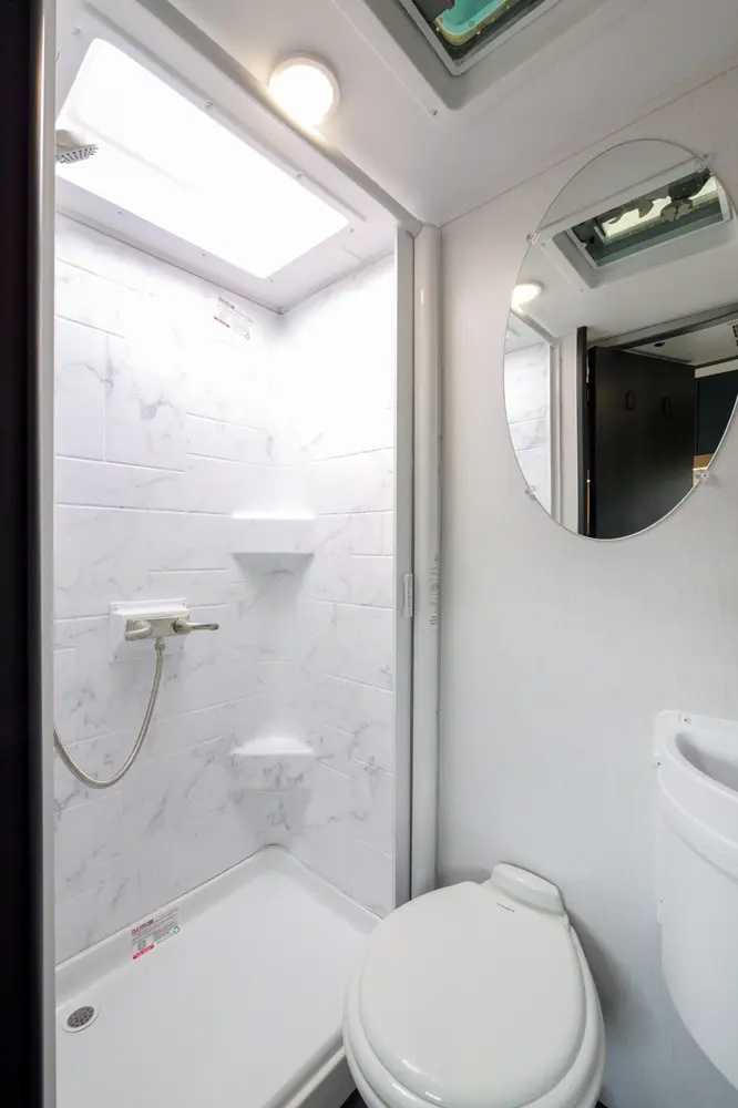 • 3-piece dry bath — separate shower, porcelain toilet, and vanity sink