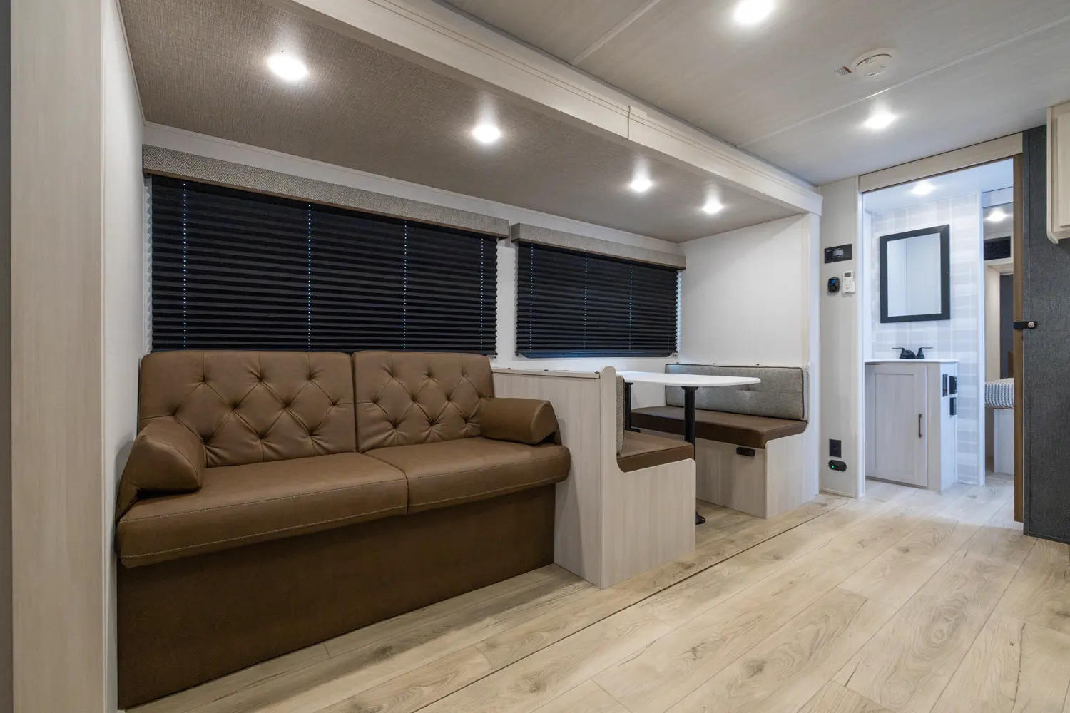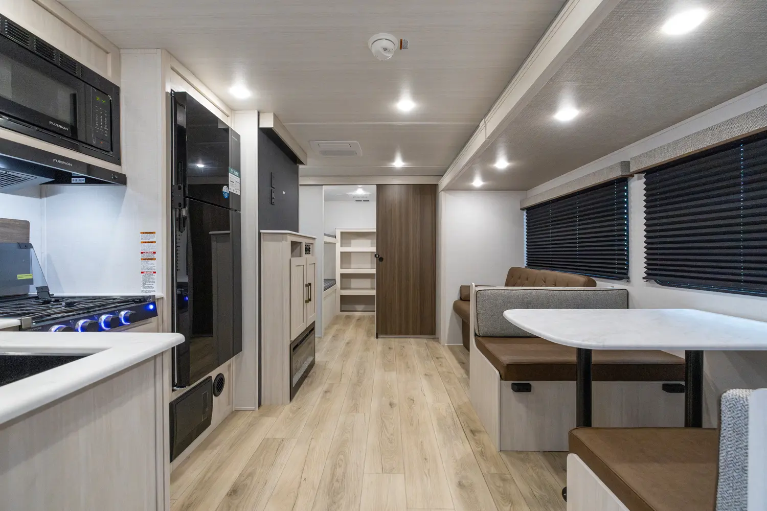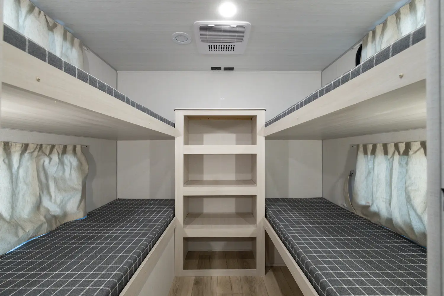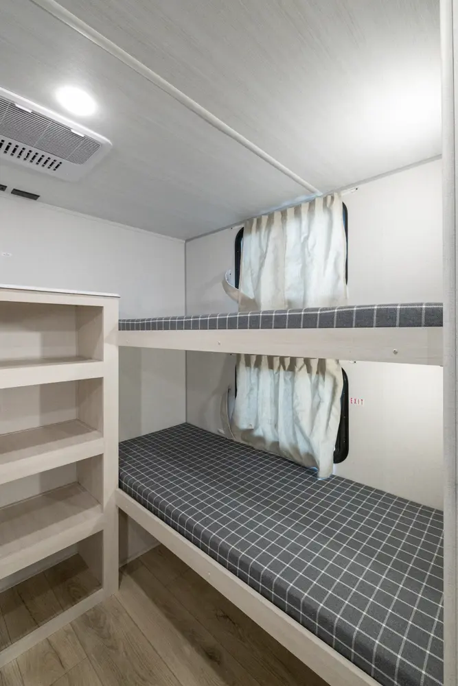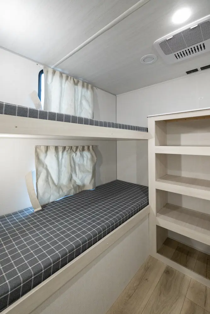 This 35' 1" travel trailer features a front private bedroom with a queen bed and ample storage. The rear private bunkhouse offers two full-size bunks and a wardrobe. The kitchen includes a 10 cu. ft. 12V refrigerator, oven, and stovetop. Living space includes a sofa and booth dinette. Exterior amenities include a 21' electric awning, outdoor camp kitchen, and a hot & cold spray port.