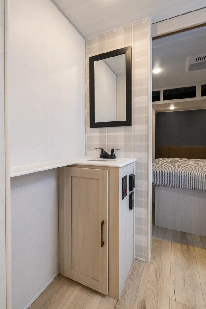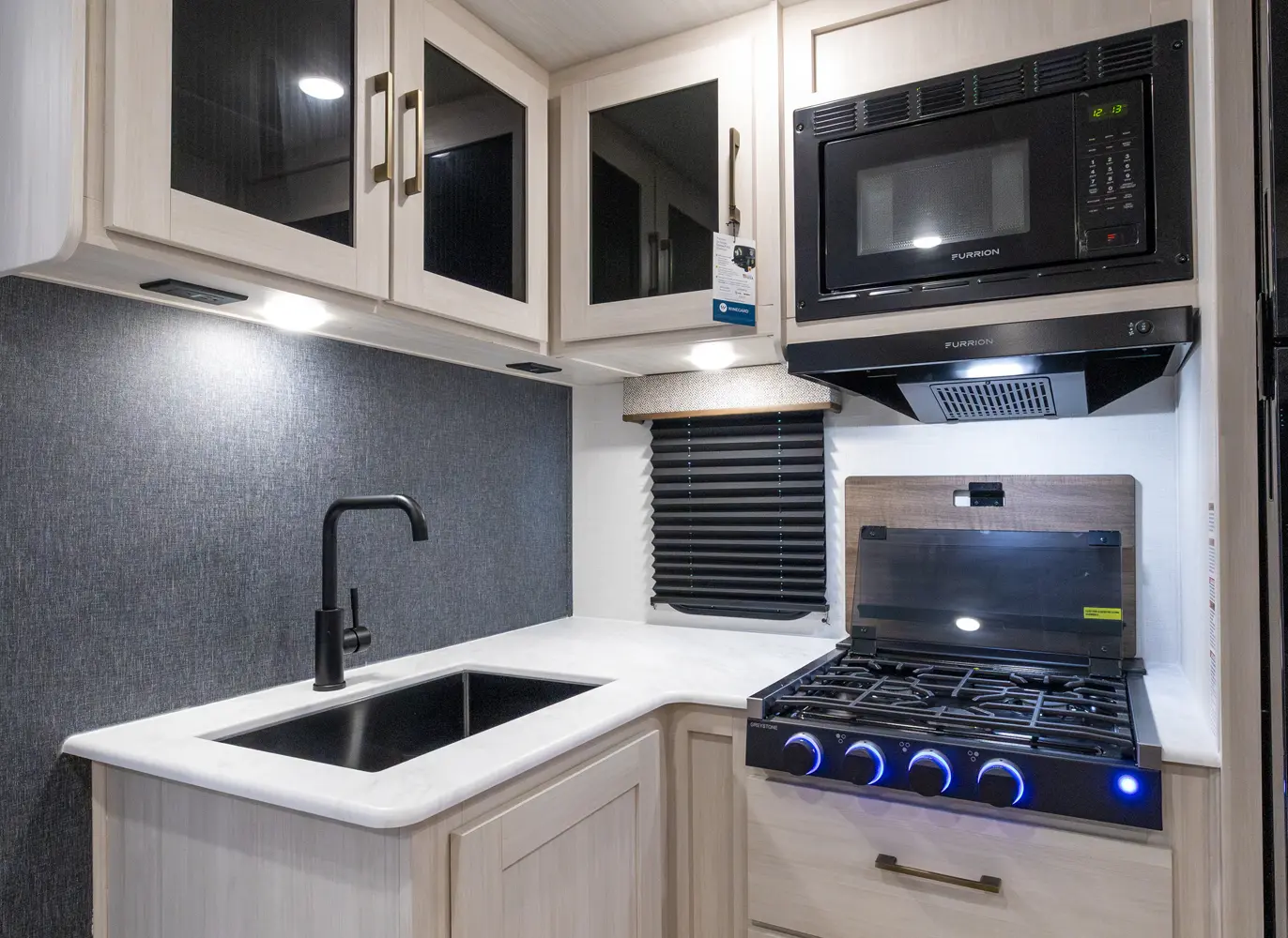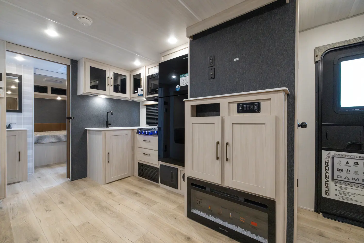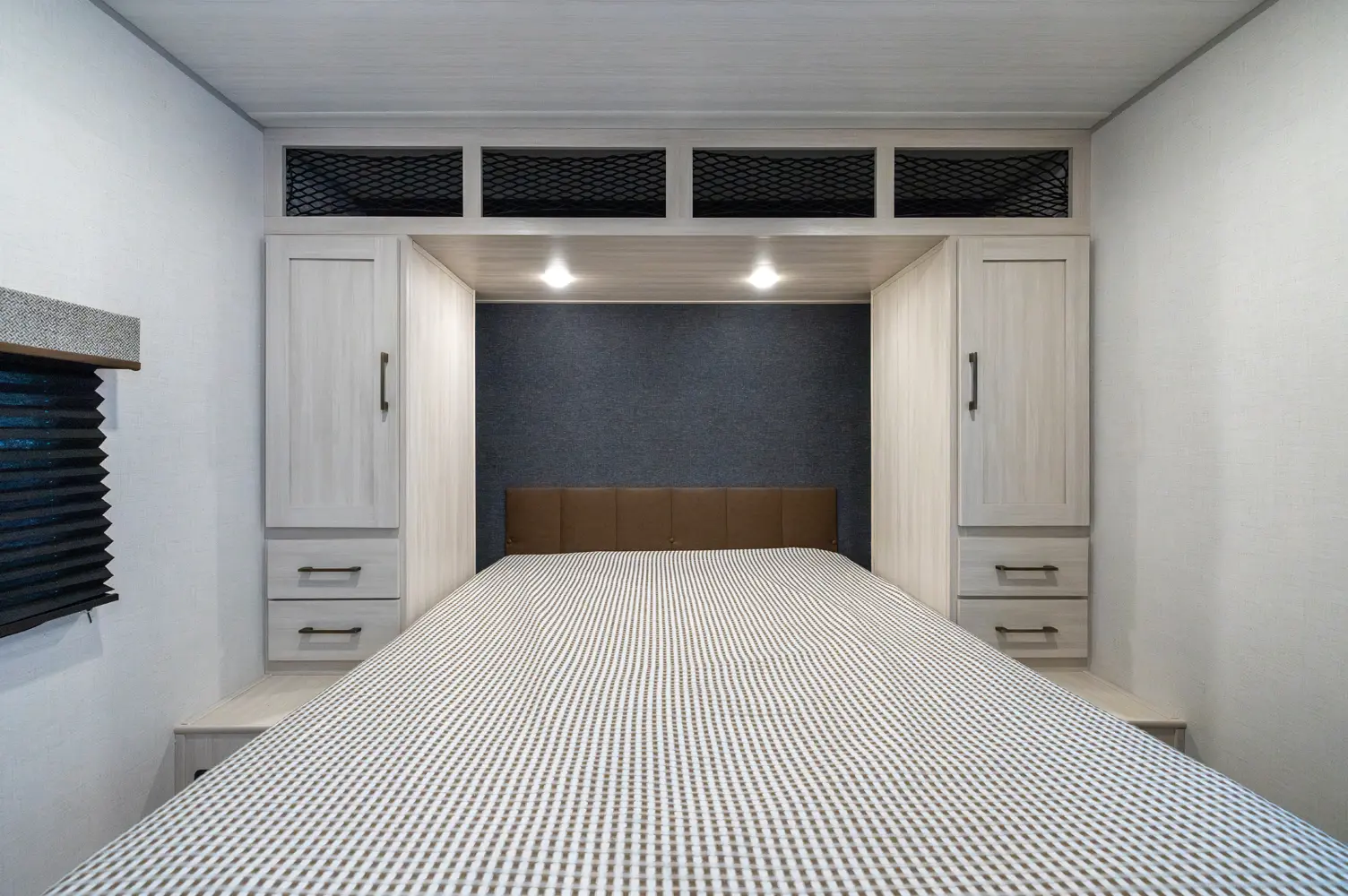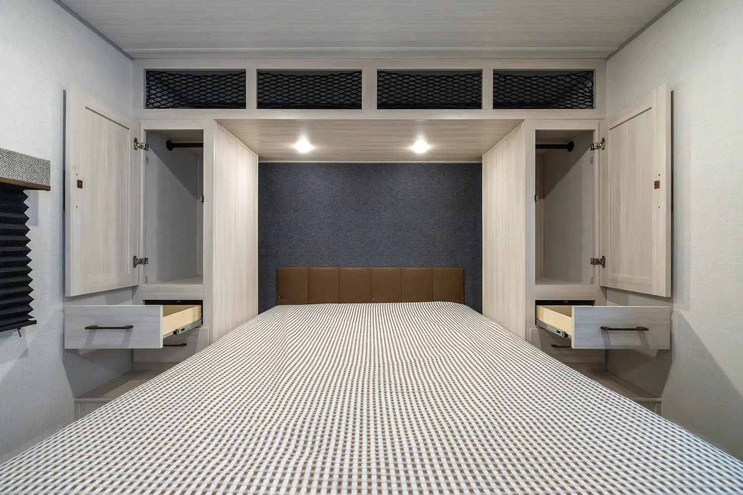 This 35' 1" travel trailer features a front private bedroom with a queen bed and ample storage. The rear private bunkhouse offers two full-size bunks and a wardrobe. The kitchen includes a 10 cu. ft. 12V refrigerator, oven, and stovetop. Living space includes a sofa and booth dinette. Exterior amenities include a 21' electric awning, outdoor camp kitchen, and a hot & cold spray port.
