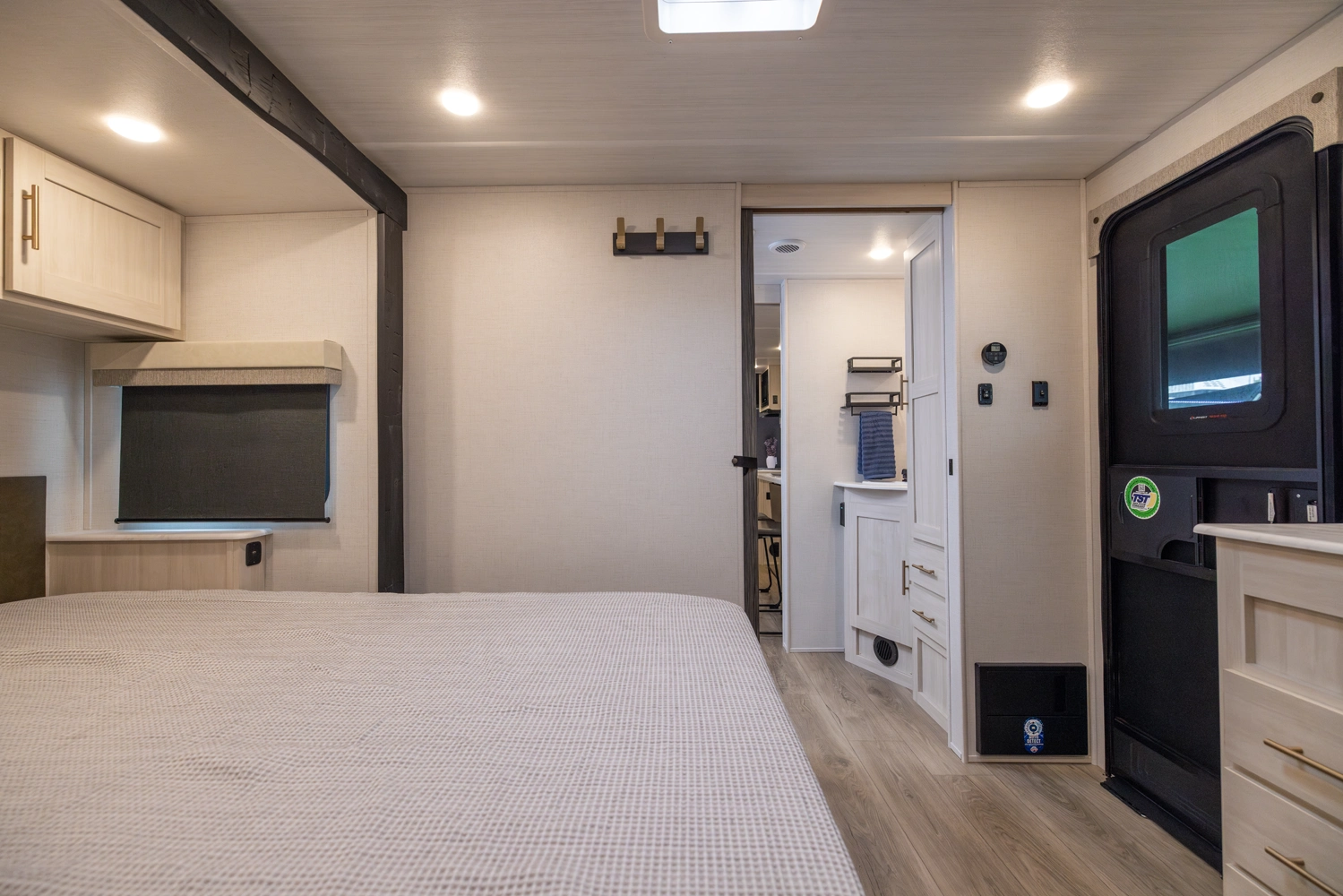 The Un•Mapped 25FK features a front kitchen with a 12V black glass refrigerator and an air fryer microwave. The Bar2Table pull-out dinette and TrailGate outdoor bar enhance dining flexibility and outdoor entertaining. Inside, enjoy a king bed, 15K A/C, and a tankless on-demand water heater. Exterior amenities include a 21' powered awning and a hot & cold spray port.